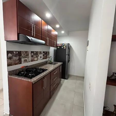 Take delight in a full kitchen provided at Espectacular Apartamento Conjunto Piedemonte and complete with a fridge, a stove top, and kitchenware for your convenience.